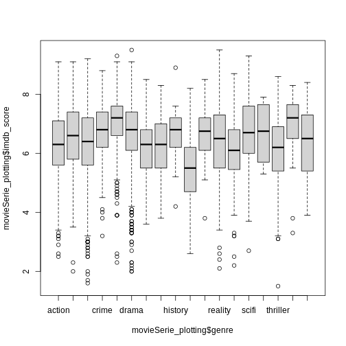 boxplot(movieSerie_plotting$imdb_score~movieSerie_plotting$genre)